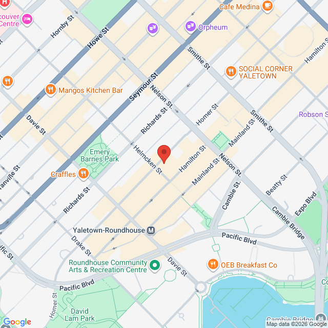 The closest SkyTrain station is Yaletown–Roundhouse Station, about 4 minutes’ walk to the office.